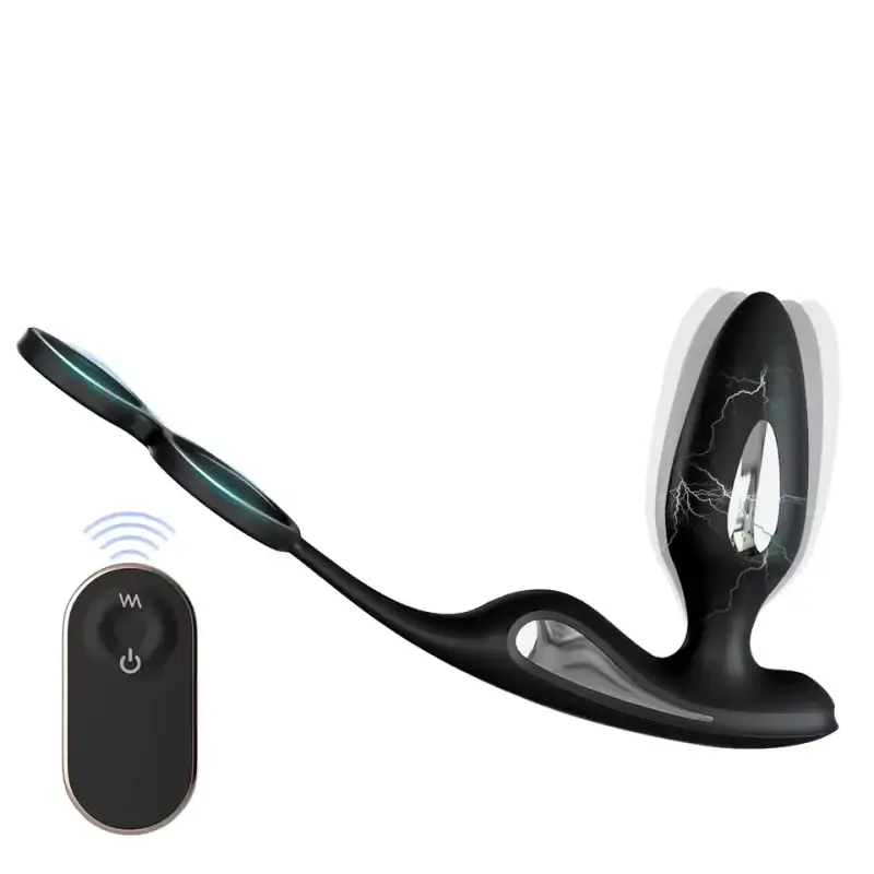 Treat yourself to shock stimulation with this prostate vibrator in the form of a buttplug, cockring and scrotalring duo, and insistently sensual electronic stimulation pulses.