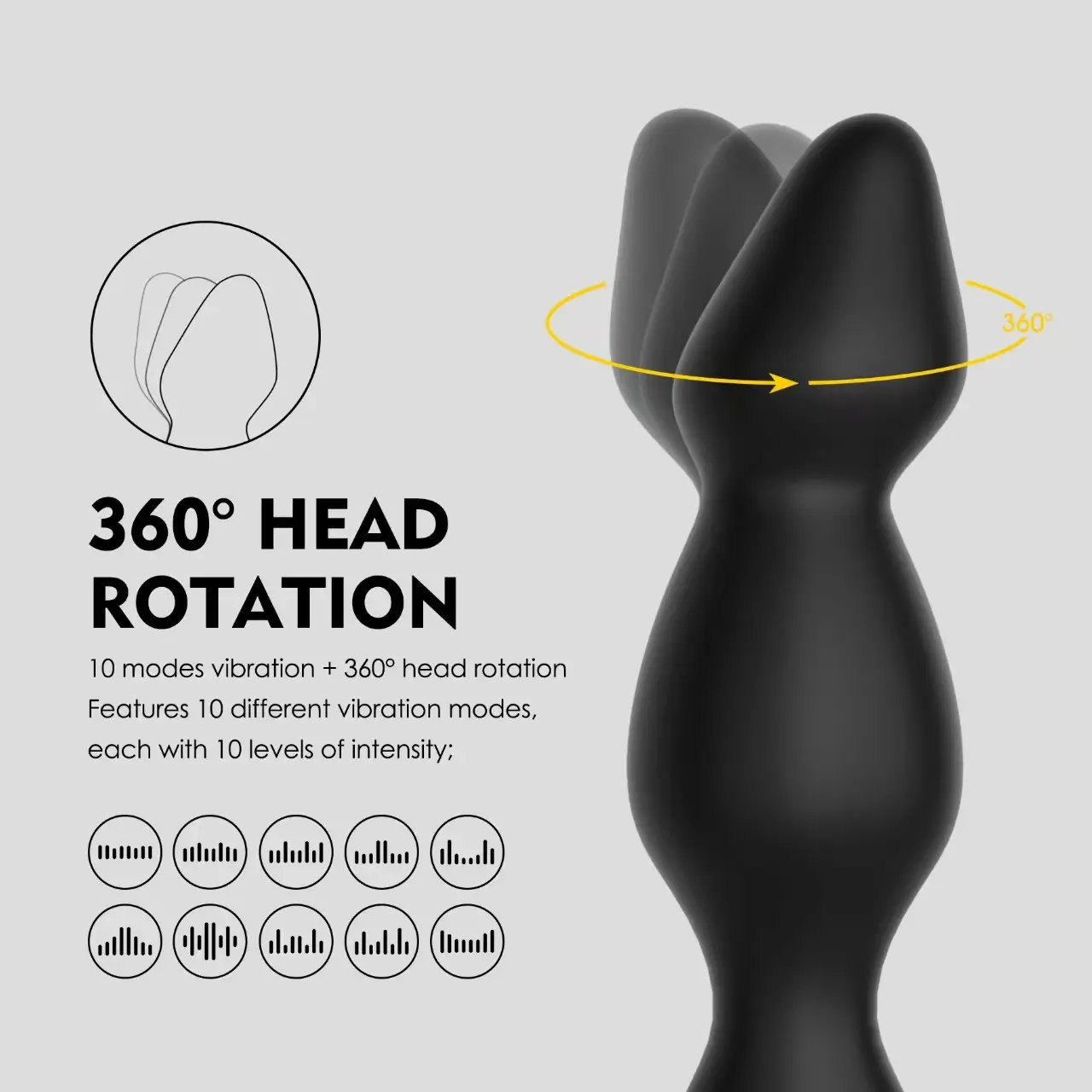 The product is designed to offer a unique sensory experience with a vibration intensity of 4 out of 5 on a scale of 1 to 5. It also emits an undetectable level of noise, measuring at 4 out of 5 on a scale of 1 to 5. The product functions as follows: The device offers 10 vibration patterns and 10 rotation patterns.